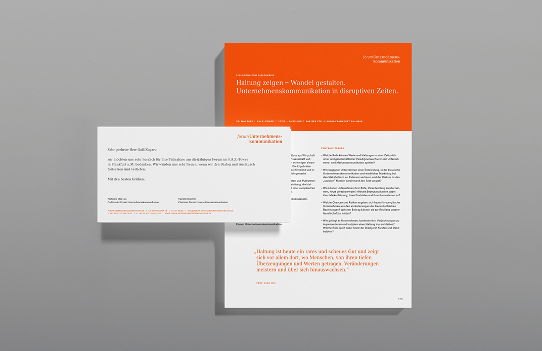 The accompanying brochure documents the entire discourse of the fourth Forum Unternehmenskommunikation. While clear hierarchies and targeted emphases provide orientation, a structured grid ensures a smooth reading experience. The topics discussed at the event are thus presented in an easily understandable way for the reader and placed within a visually engaging and varied context.