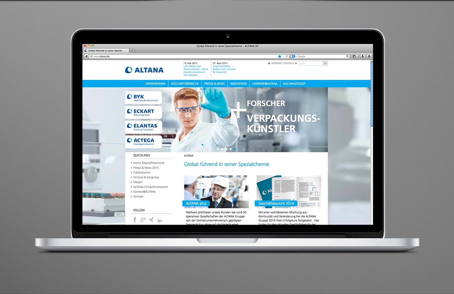 Insgesamt ein spannendes und vielschichtiges Projekt, das den Mehrwert definiert, den ALTANA als weltweit führendes Spezialchemieunternehmen Tag für Tag seinen Kunden und Mitarbeitern bietet. Die Kampagne wurde für ihre Kommunikationskraft und Effizienz mit dem internationalen Fox Finance Visual Award und dem Fox Finance Effizienz Award, jeweils in Silber, ausgezeichnet.