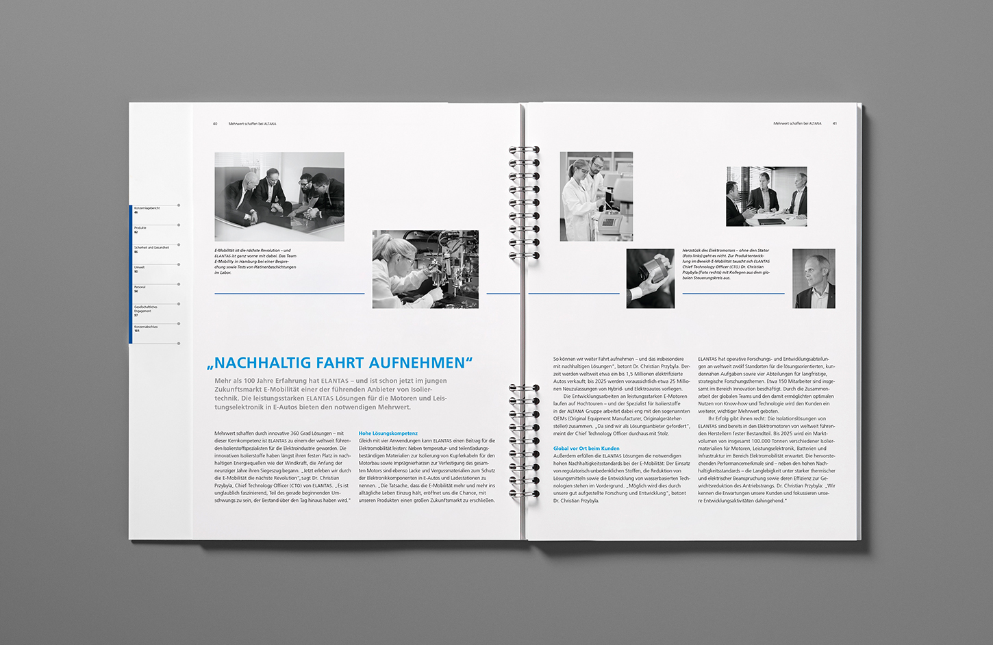 Im Verbund mit der eindrucksvollen Fotografie des Münchner Fotografen Robert Brembeck, der es versteht, die handelnden Personen in großer Natürlichkeit abzubilden, und der schon seit einer Reihe von Berichten für die Bildsprache der ALTANA AG verantwortlich zeichnet, entstehen glaubwürdige Erzählstücke, die den Leser in sechs Etappen tief in die Herzkammer des Wertschöpfungspotenzials des weltweit führenden Spezialchemie-Unternehmens führen.