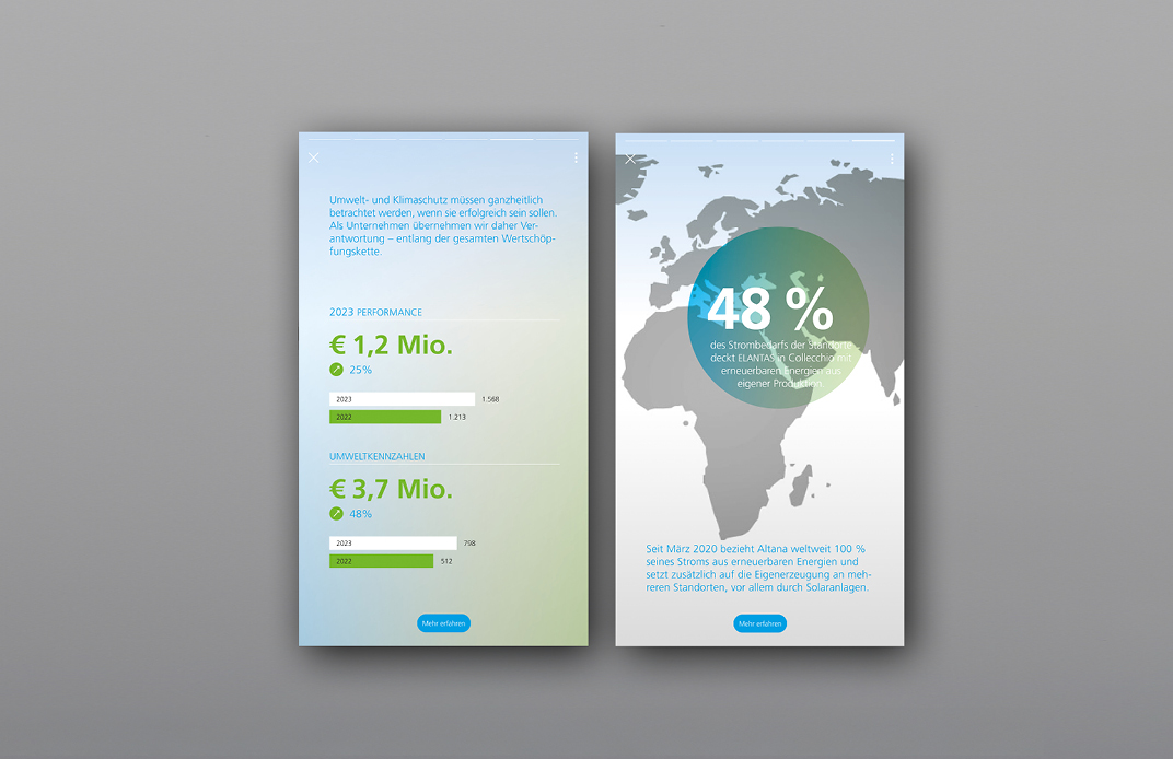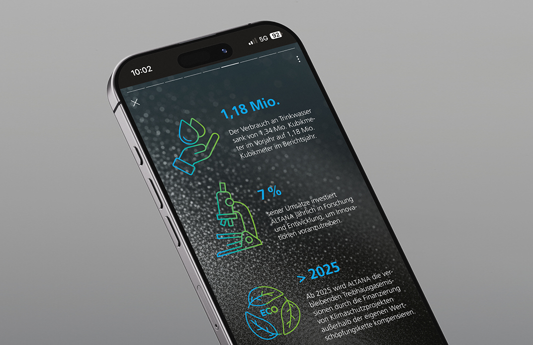 Additional graphic elements and icons in the characteristic green-blue gradient create clear visual accents and facilitate content navigation. The typographic design is based on the Frutiger typeface and uses different weights to ensure good readability and clearly mark content hierarchies.