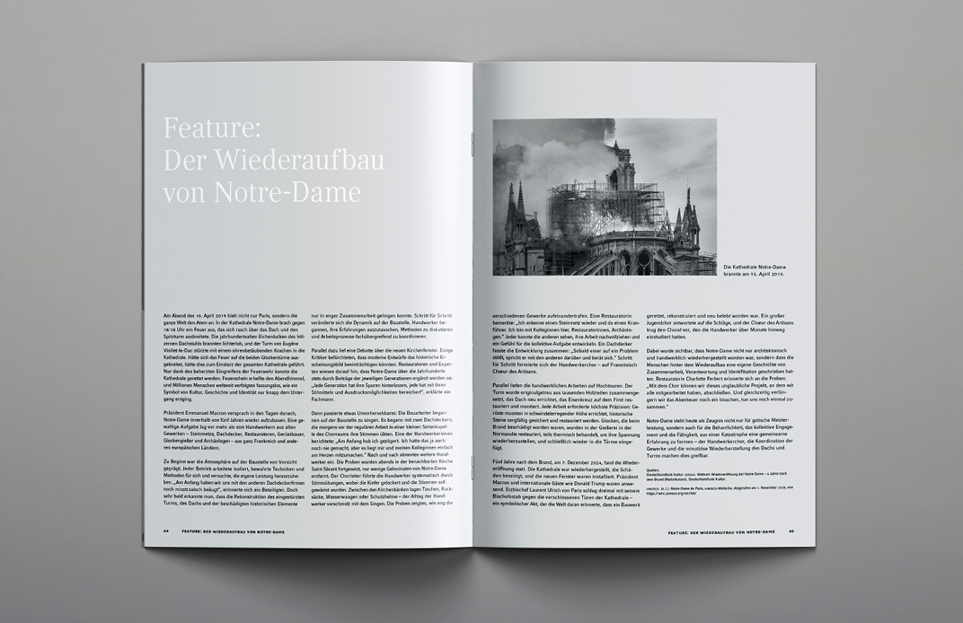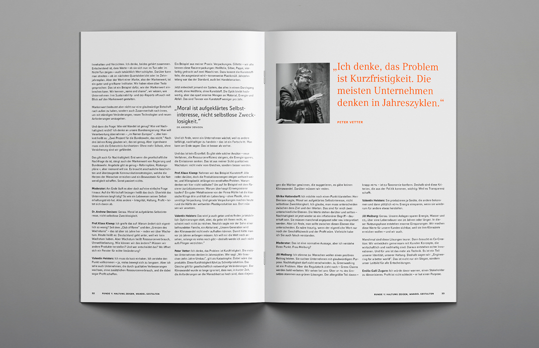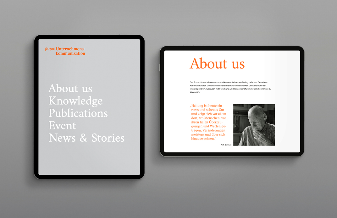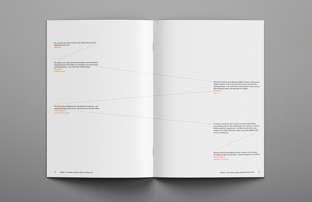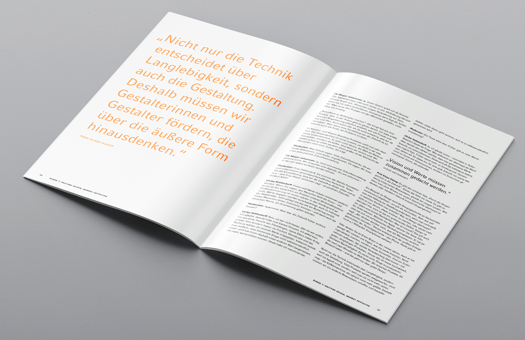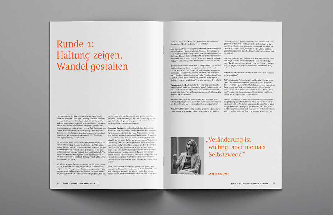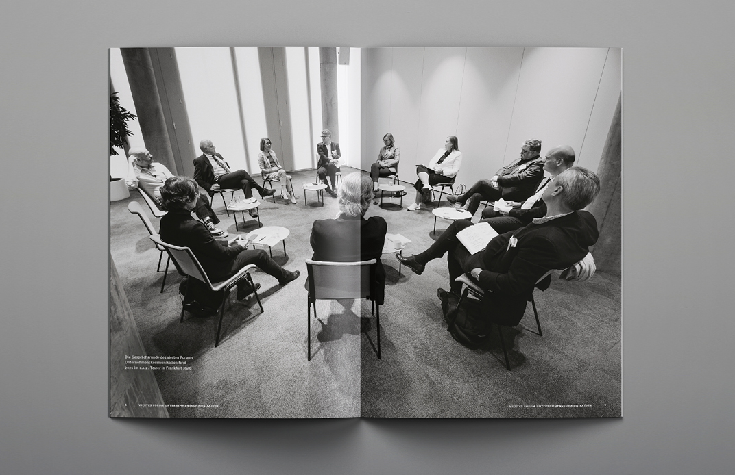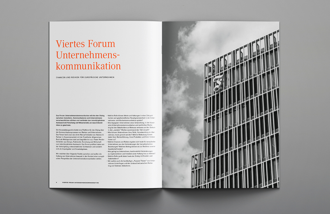 The accompanying brochure documents the entire discourse of the fourth Forum Unternehmenskommunikation. While clear hierarchies and targeted emphases provide orientation, a structured grid ensures a smooth reading experience. The topics discussed at the event are thus presented in an easily understandable way for the reader and placed within a visually engaging and varied context.