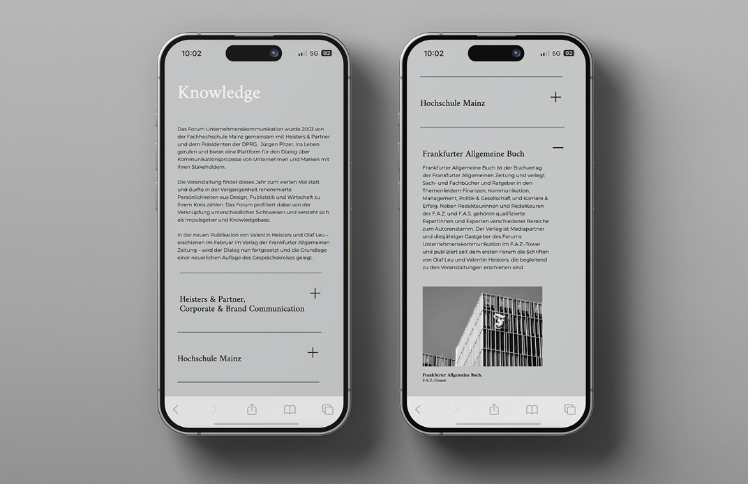 The website serves as an information and communication platform for the event series, bringing together the program, interesting facts, and news about the forum on an easily navigable interface. The clear grid and subtle interactions guide visitors intuitively through the content and translate the forum's design philosophy into the digital realm.