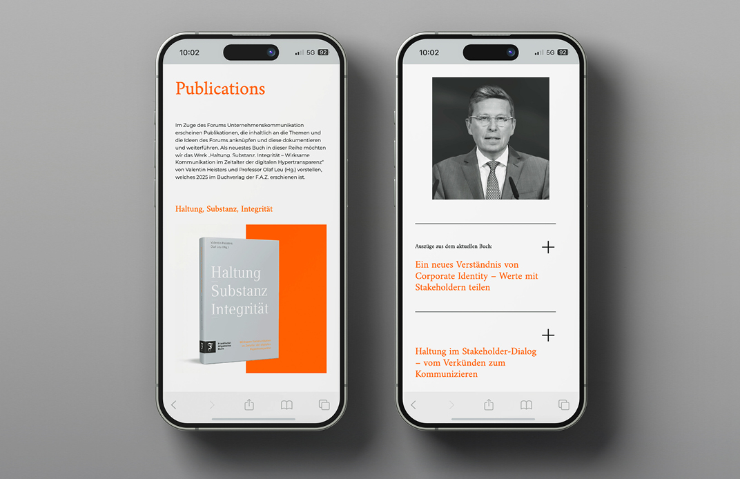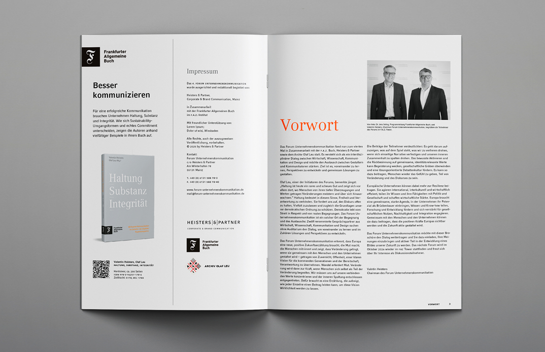 The fourth Forum Unternehmenskommunikation was based on the book »Haltung, Substanz, Integrität – Wirksame Kommunikation im Zeitalter der digitalen Hypertransparenz« by Valentin Heisters and Professor Olaf Leu (eds.). It was designed in-house and published by the F.A.Z. publishing house. The topics covered in the book provided the basis for the forum's discussions and shaped the event's thematic framework.