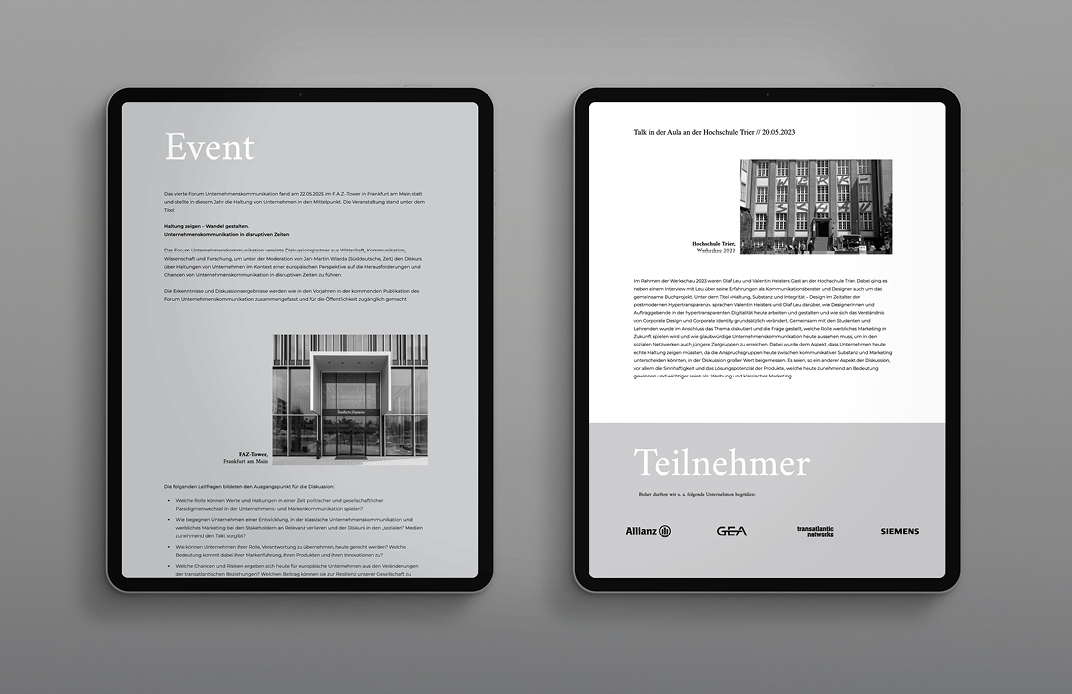 The focus is on the event series, which is supported by various communication media. The website serves as the communicative foundation, digitally enhancing the event experience. Supplemented by an invitation letter for participants, greeting cards, and a brochure, a consistent overall presentation is created.