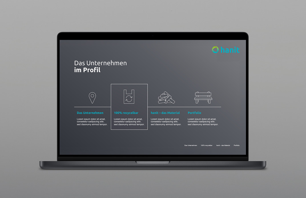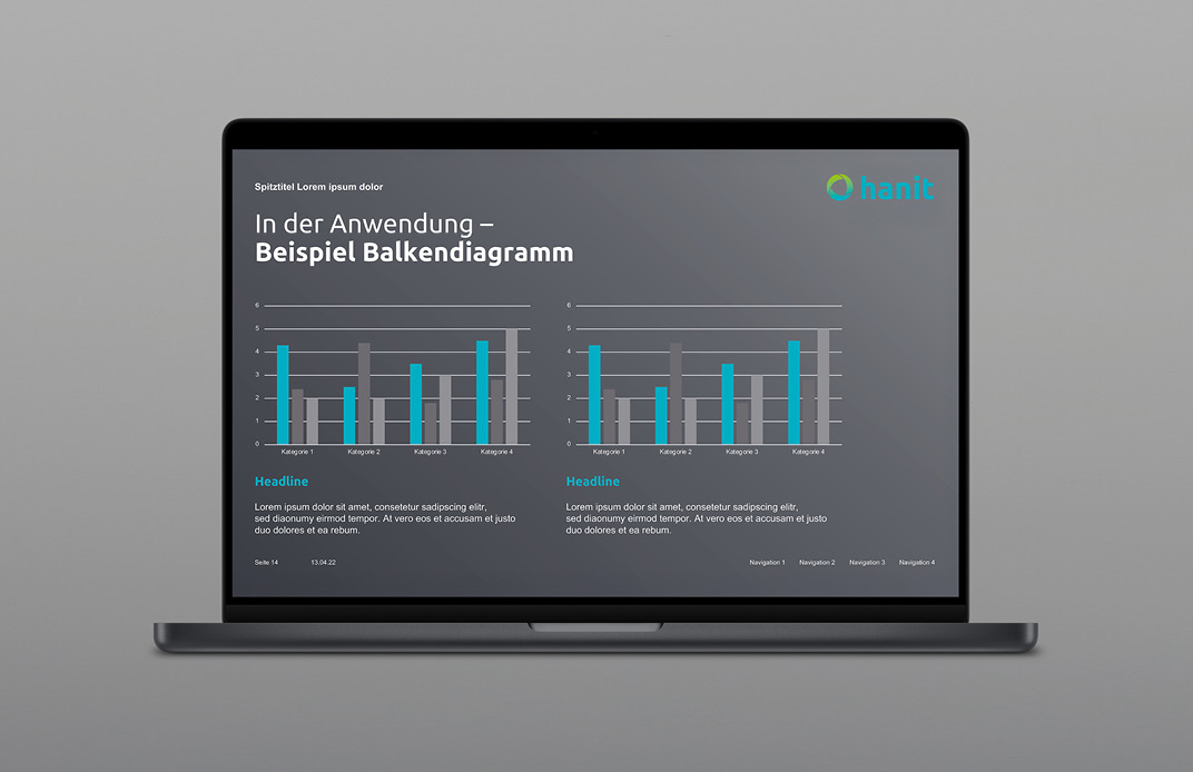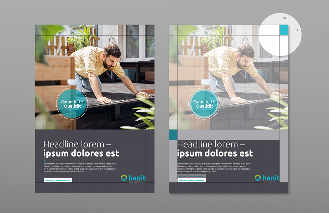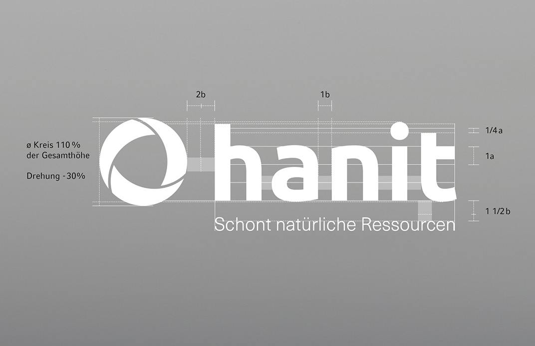 White and dark gray form the design basis – inspired by the material hanit. These two colors are at the top of the brand identity. Turquoise serves as a guiding brand accent, while a defined color spectrum for sub-brands creates differentiated recognition.