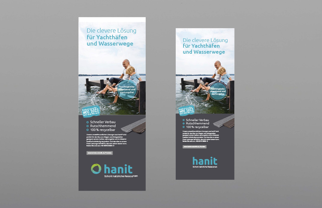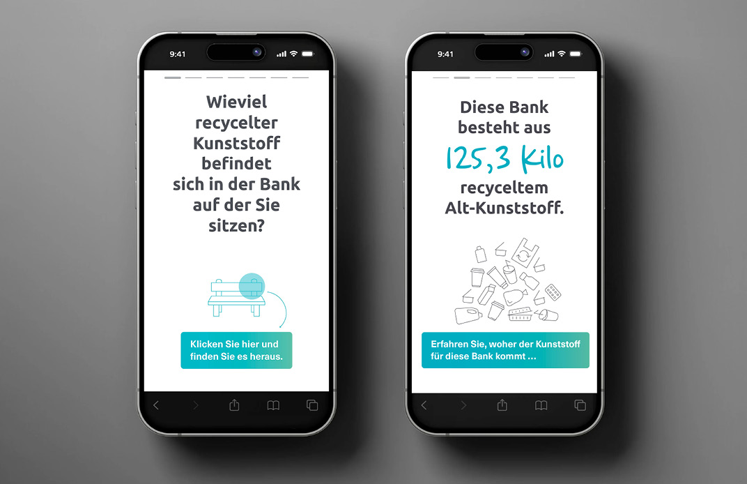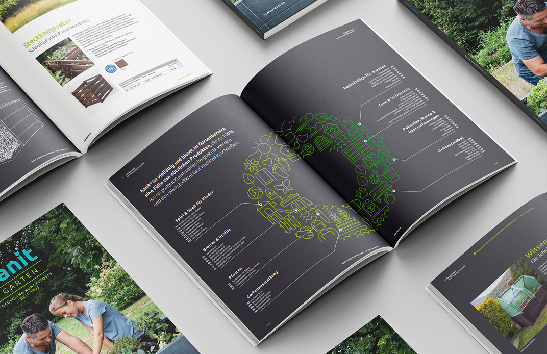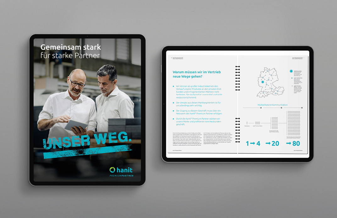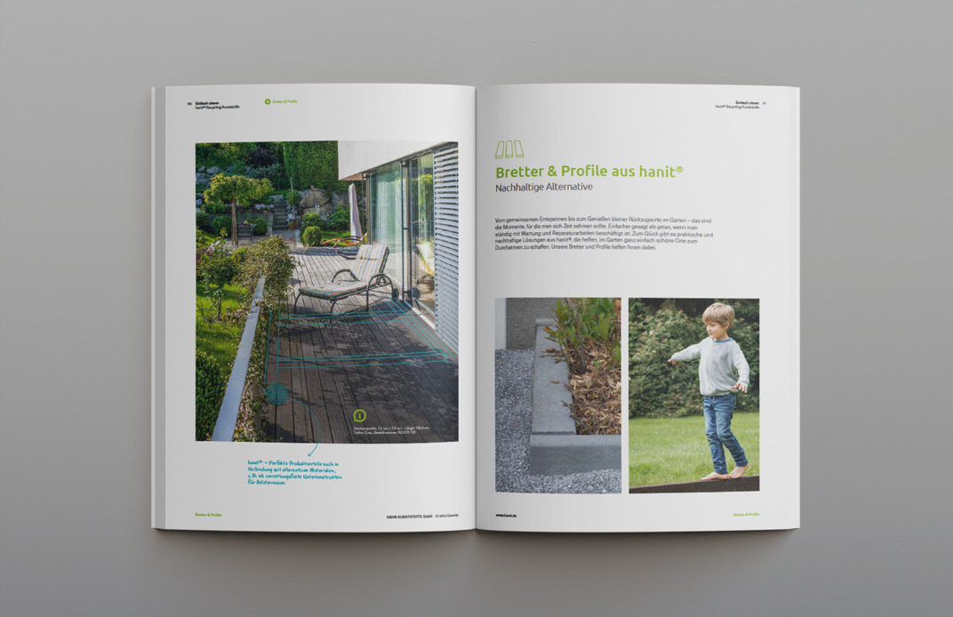 White and dark gray form the design basis – inspired by the material hanit. These two colors are at the top of the brand identity. Turquoise serves as a guiding brand accent, while a defined color spectrum for sub-brands creates differentiated recognition.